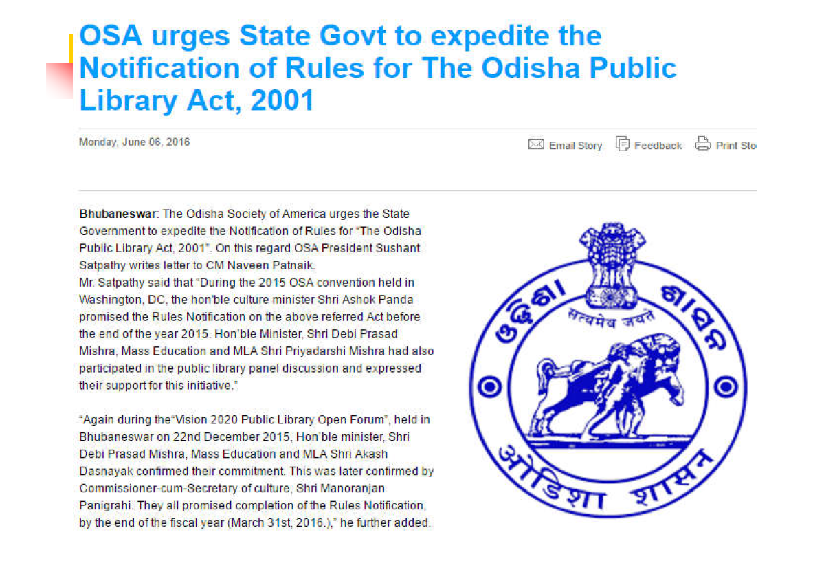 The Odisha Society of the Americas(OSA) had taken the initiative to establish Information & Communication Technology(ICT) enabled rural model public library in Baghada Gram Panchayat(GP), Suliapada Block in Mayurbhanj district. The OSA had proposed to establish the model public library in the Rajiv Gandhi Seva Kendra with 3 rooms comprising Internet Room, Community Center, and a Reading Room.